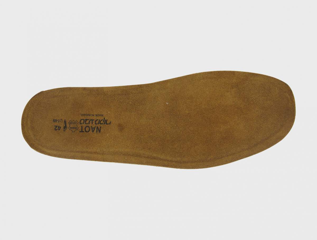 Naot's Console Footbed is removable, anatomic and made of cork & latex covered in suede. This footbed molds to the shape of the foot with wear like a footprint in the sand.