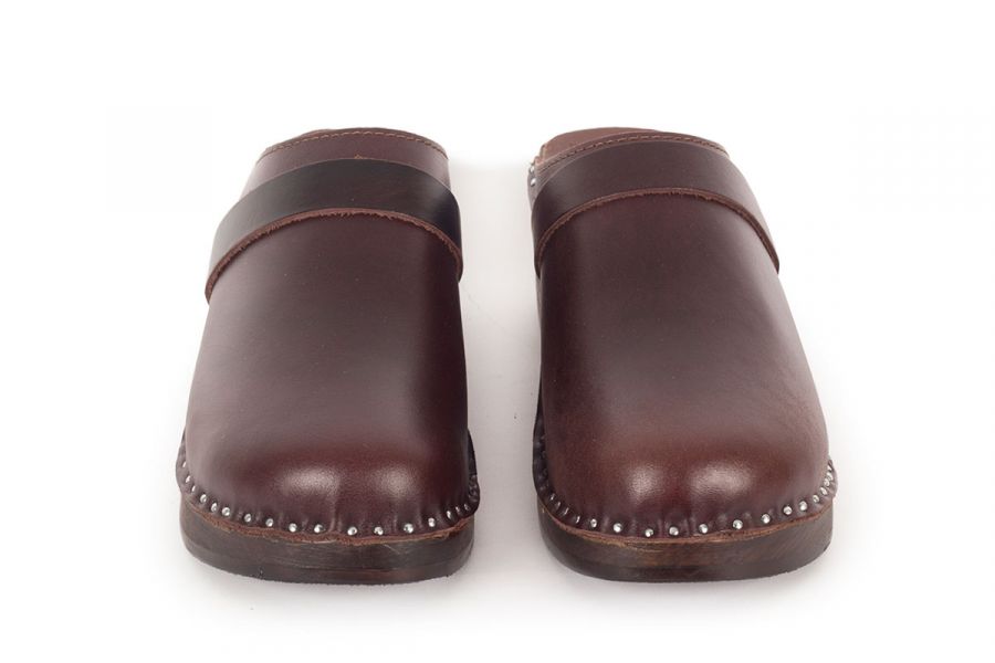 Da Vinci clogs in brown pull up leather with a classic strap over the instep. Made on our brown Original wooden bottoms.