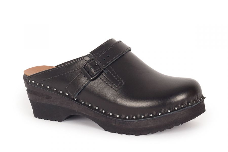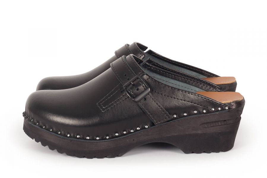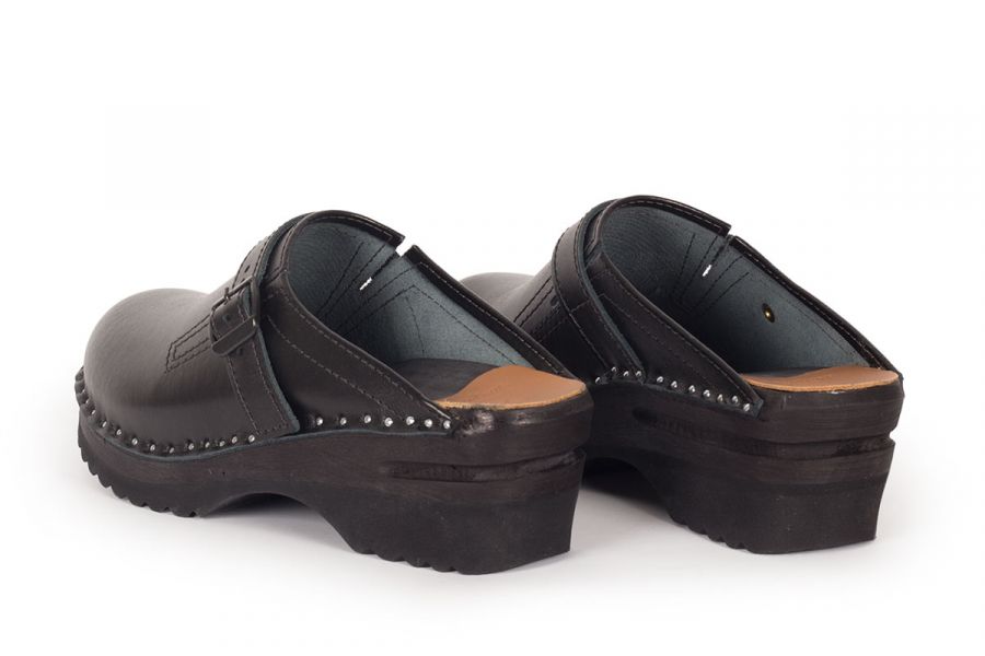 Donatello was designed in the early 60s and comes with an adjustable strap over the instep. Here the clogs come in black leather and on a black wooden Ideal bottom. These clogs are available in two different lasts. Choose G for a regular fit and choose H if you have a high instep or wide foot.