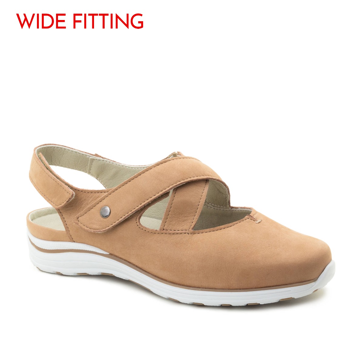 Melanie is a cross-over shoe with a halter strap and Velcro fastenings.