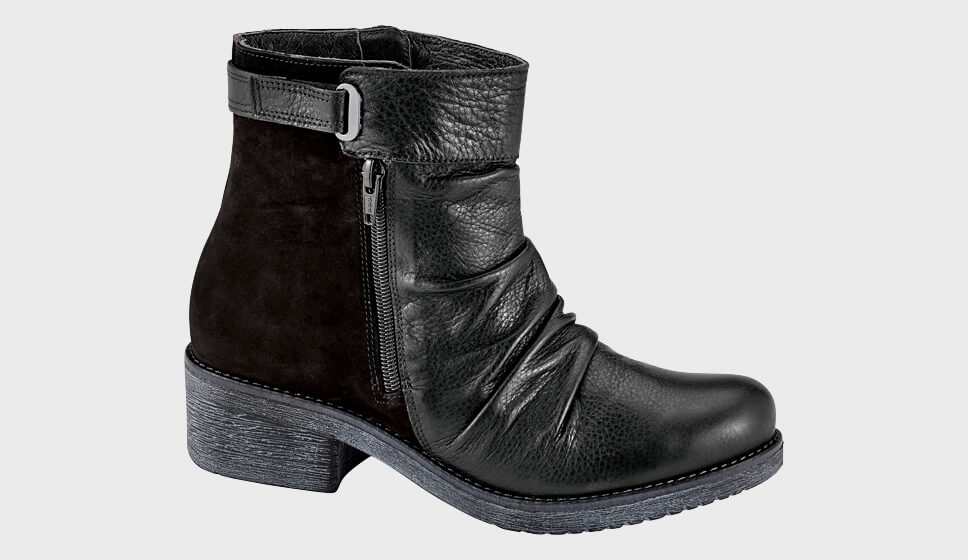 Look effortlessly cool in the Artsy. Ruched suede and contrasting leather/nubuck are outfitted with dual side zippers and a hook and loop ankle strap to allow ease in wear.