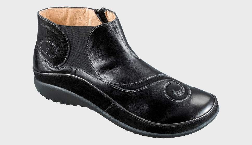 The Chi is a bootie with a unique contrasting swirl design. This style has a heel cup for support. The Chi has an inside zipper for accessibility and gore for adjustability. The Chi has a 3.5" shaft. Naot's removable, anatomic cork & latex footbed is wrapped in pampering suede and molds to the shape of the foot with wear. The Koru Collection features a 1" polyurethane sole which is extremely lightweight, durable & slip resistant. This collection uses a hand-sewn Strobel construction making it strong and extremely flexible.
