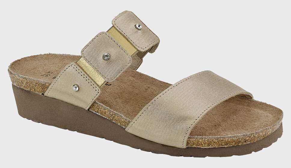 The Naot Ashley is a feminine slide sandal with rhinestone accents across the instep and gore for adjustability. Naot's anatomic cork & latex footbed is wrapped in a pampering suede and molds to the shape of the foot with wear.