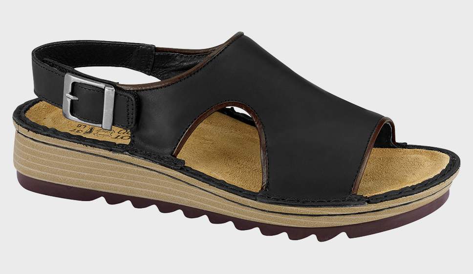 The Ficus is a great transitional sandal with a full padded upper. This style features a faux buckle hook & loop backstrap for accessibility. Naot's removable, anatomic cork & latex footbed is wrapped in pampering suede and molds to the shape of the foot with wear. The Bloom Collection features a 1.75'' polyurethane sole which is extremely lightweight, and durable.