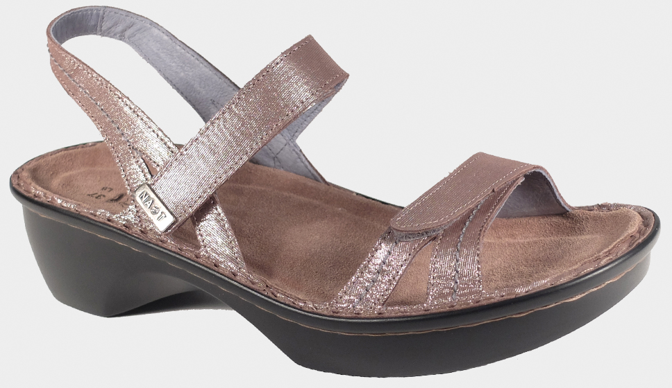 The Naot Brussels is a trendy sandal with a backstrap to give extra support and stability. This style features a double hook and loop for adjustability and has rhinestones on the instep strap. The Cosmopolitan Collection features a 2" polyurethane sole with a metal shank and is extremely lightweight and durable.