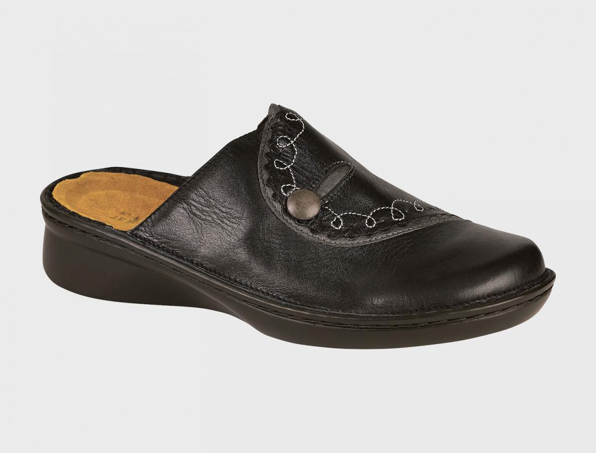 The Naot Encore is a unique clog with contrasting leathers, accent stitch designs and a faux button. This style has gore at the inside of the instep for adjustability. The Encore has a padded Naot's removable, anatomic cork & latex footbed is wrapped in pampering suede and molds to the shape of the foot with wear. The Allegro Collection features a 1.5" polyurethane sole which is extremely lightweight and durable.