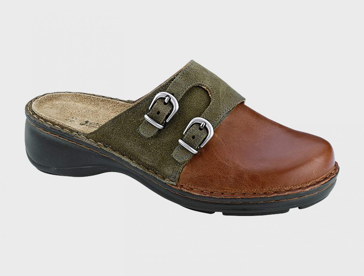 The Leilani is a great everyday comfort clog. This style has a hook and look with faux buckles and contrasting leathers. Naot's removable, anatomic cork & latex footbed is wrapped in pampering suede and molds to the shape of the foot with wear. The Floral Collection features a 1.5" polyurethane sole with a metal shank and is extremely lightweight and durable.