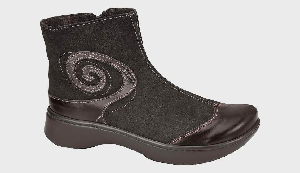 The Oyster is an ankle boot with a unique contrasting swirl design. This style has padded technical lining for ultimate comfort & warmth. The Oyster features a zipper closure for adjustability. Naot's removable, anatomic cork & latex footbed is wrapped in pampering suede and molds to the shape of the foot with wear. The Shell Collection features a 1.5" polyurethane sole which is extremely lightweight and durable.