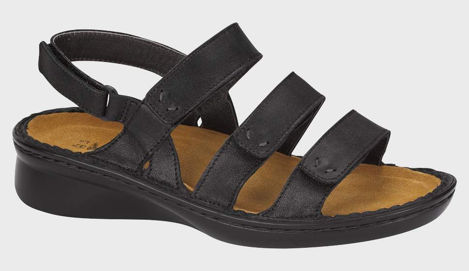 The Naot Jive is a fully adjustable backstrap sandal with accent stitch design. Naot's removable, anatomic cork & latex footbed is wrapped in pampering suede and molds to the shape of the foot with wear. The Allegro Collection features a 1.5" polyurethane sole which is extremely lightweight and durable.