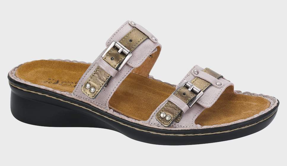 The Naot Karaoke is a slide sandal with a padded upper and is a slightly wider fit. This style features a double buckle strap with hidden hook and loop for support and adjustability. Naot's removable, anatomic cork & latex footbed is wrapped in pampering suede and molds to the shape of the foot with wear. The Allegro Collection features a 1.5" polyurethane sole which is extremely lightweight and durable.