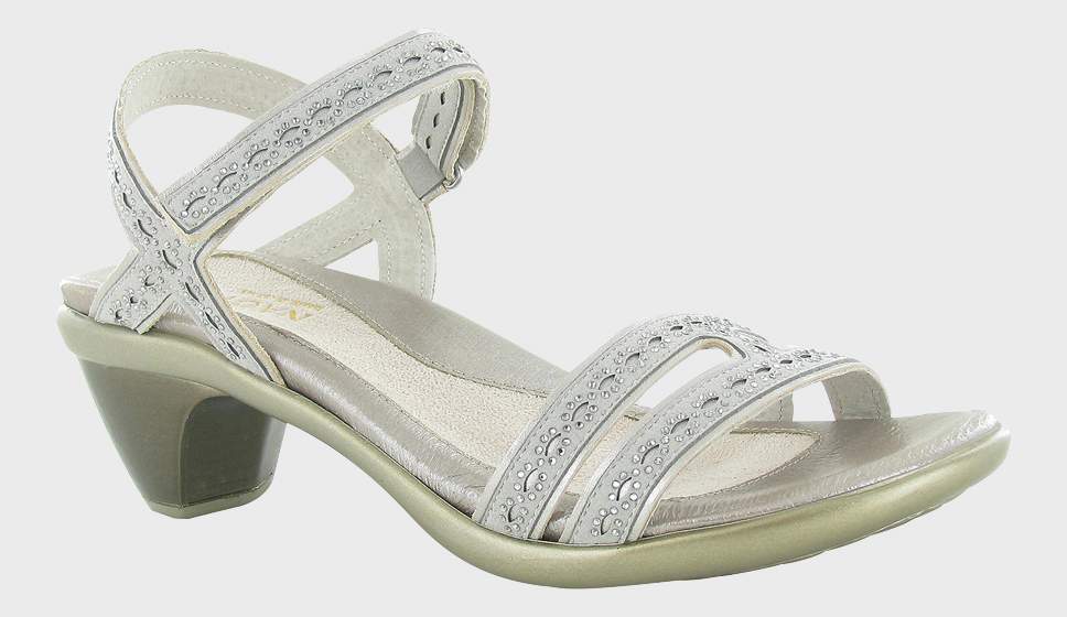 The Idol is a dressy sandal that will "wow" with beautiful stone accents. The back strap provides extra stability while containing a hook and loop closure for adjustability. Naot's anatomic cork & latex footbed is wrapped in leather with a microfiber center to prevent slipping and molds to the shape of the foot with wear. The Avantgarde Collection features a TPR sole with a metal shank. This sole offers the look of a 2" heel without the feel.