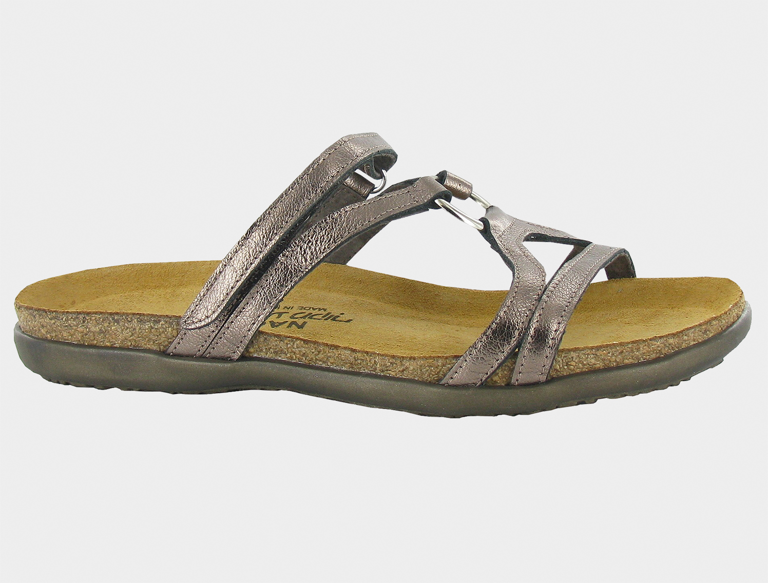 The Carmen is a feminine strappy slide with a metal ring hardware. A hook & loop at the instep, provides perfect adjustability. Naot's anatomic cork & latex footbed is wrapped in a pampering suede and molds to the shape of the foot with wear. The Flat Elegant Collection features a .75" TPR sole.