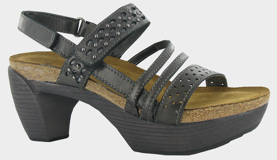 Naot Relate is a unique sandal, designed with a polyurethane sole, leather lining, a cork/latex footbed wrapped in suede, a metal shank, arch support, and a lightweight feel.