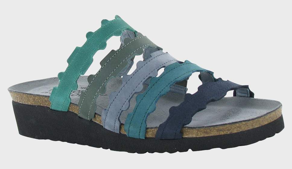 The Adina slide is sure to brighten up any Spring day with its soft, seasonal hues and scalloped edged straps in nubuck and leather. This style has three gore straps for adjustability. Naot's anatomic cork & latex footbed is wrapped in a pampering suede and molds to the shape of the foot with wear.
