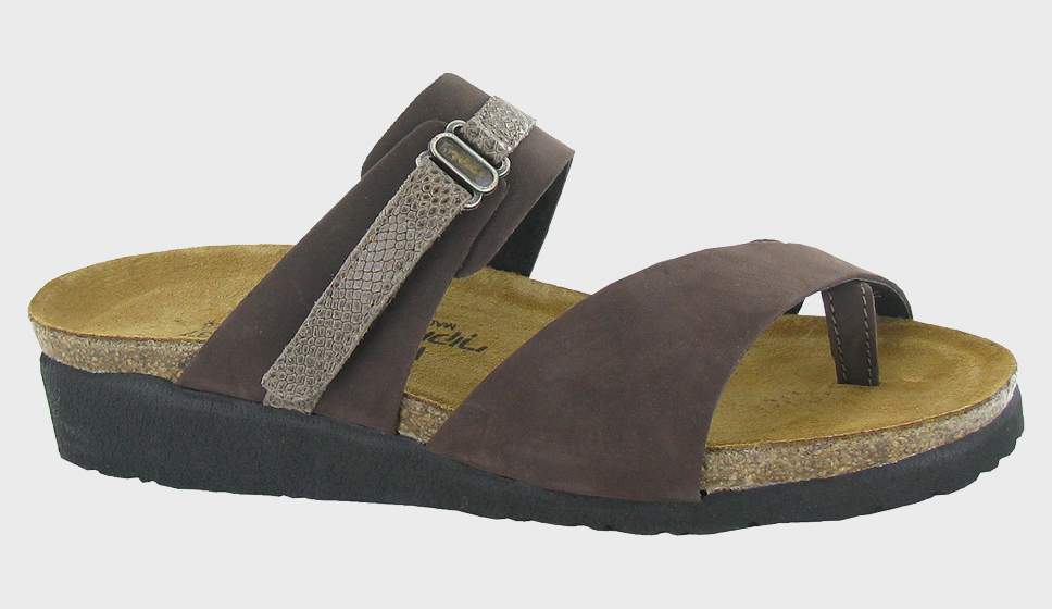 The Naot Jessica is a slide sandal with a hook & loop strap at the instep. This style has a toe loop which helps holds the foot in place when walking. Naot's anatomic cork & latex footbed is wrapped in a pampering suede and molds to the shape of the foot with wear.
