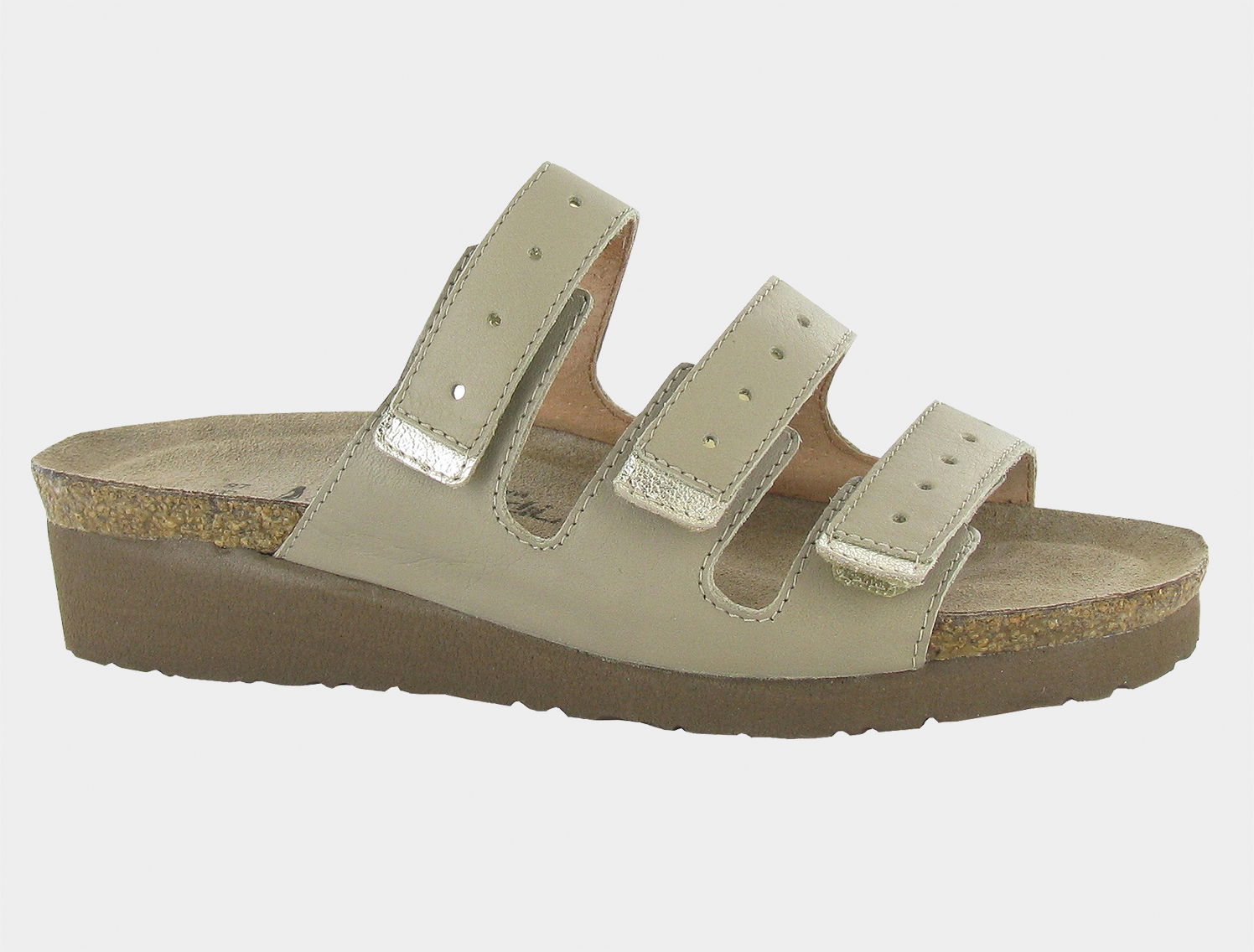 A strappy slide featuring a perforated design. The Madelyn offers three hook and loop straps for full adjustability. Naot's anatomic cork & latex footbed is wrapped in a pampering suede and molds to the shape of the foot with wear.