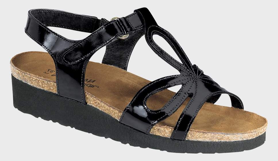 The Rachel is a feminine sandal with a hook & loop strap at the instep and a backstrap for added stability and support. The Rachel has a unique floral inspired design at the front. Naot's anatomic cork & latex footbed is wrapped in a pampering suede and molds to the shape of the foot with wear.