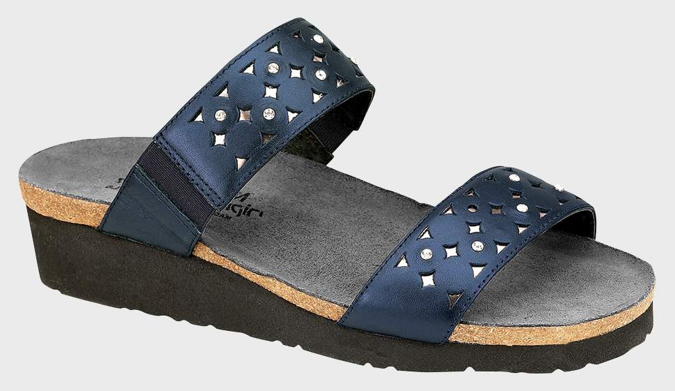 The Naot Susan is a feminine slide sandal with rhinestone accents across the straps and double gore at the instep for adjustability. Naot's anatomic cork & latex footbed is wrapped in a pampering suede and molds to the shape of the foot with wear.