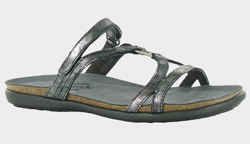 The Carmen is a feminine strappy slide with a metal ring hardware. A hook & loop at the instep, provides perfect adjustability. Naot's anatomic cork & latex footbed is wrapped in a pampering suede and molds to the shape of the foot with wear. The Flat Elegant Collection features a .75" TPR sole.