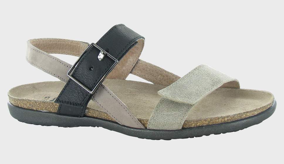 The Norah is the perfect everyday sandal. An oversized faux buckle & hook & loop front make this sandal completely adjustable. Naot's anatomic cork & latex footbed is wrapped in a pampering suede and molds to the shape of the foot with wear. The Flat Elegant Collection features a .75" TPR sole.