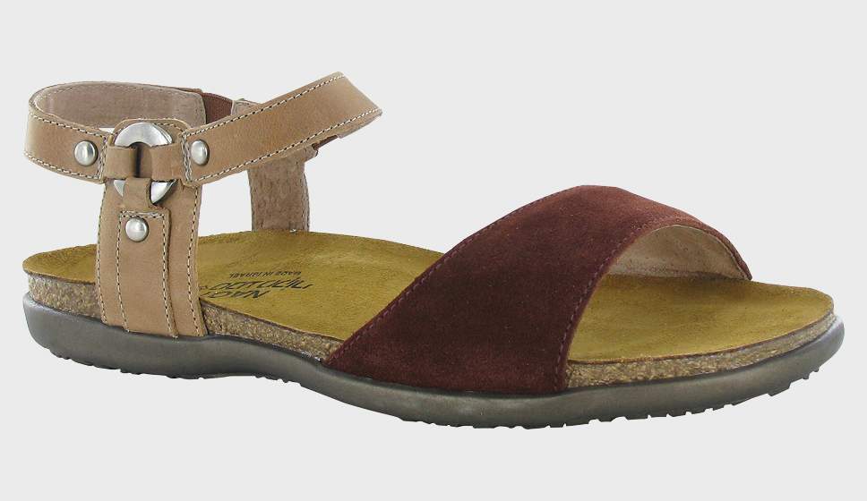 The Sabrina is a feminine sandal with metal ornament and rivet accents. This style has gore at the inside of the instep and backstrap. Naot's anatomic cork & latex footbed is wrapped in a pampering suede and molds to the shape of the foot with wear. The Flat Elegant Collection features a .75" TPR sole.