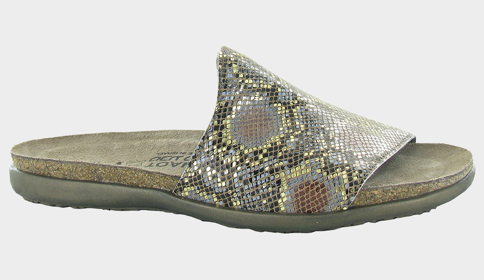 The Naot Skylar is the perfect everyday slip on, with hidden gore for adjustability. Naot's anatomic cork & latex footbed is wrapped in a pampering suede and molds to the shape of the foot with wear. The Flat Elegant Collection features a .75" TPR sole.