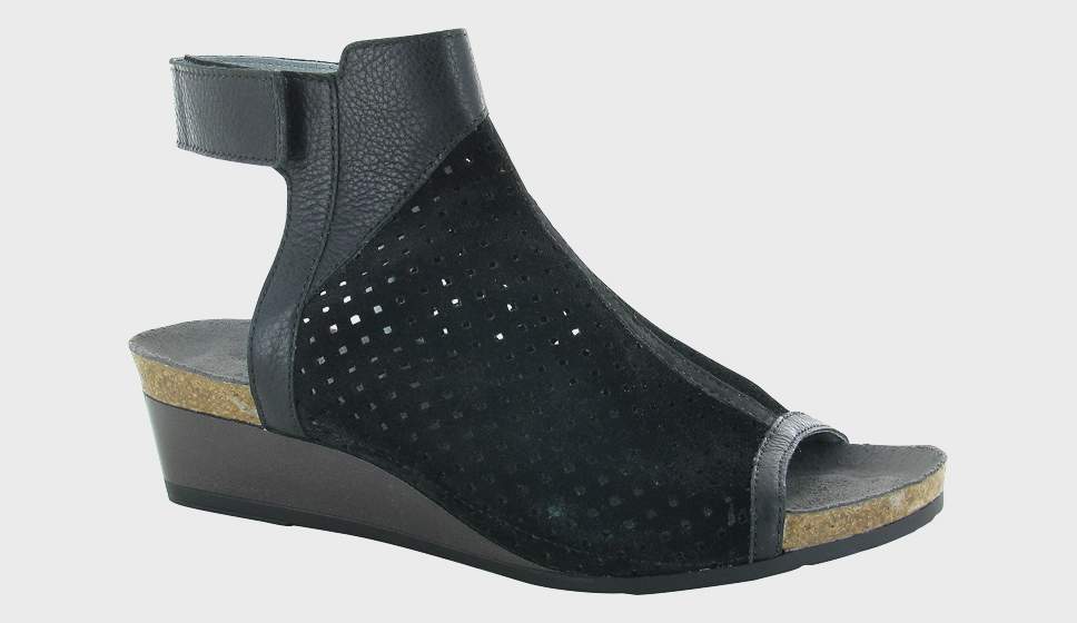 The Oz is the perfect transitional wedge for your wardrobe. This style features an open heel design with a hook and loop ankle strap for added stability. Naot's anatomic cork & latex footbed is wrapped in a pampering suede and molds to the shape of the foot with wear. The Oz is styled in perforated suede and nubuck and is offered in colors with a metallic leather accent.