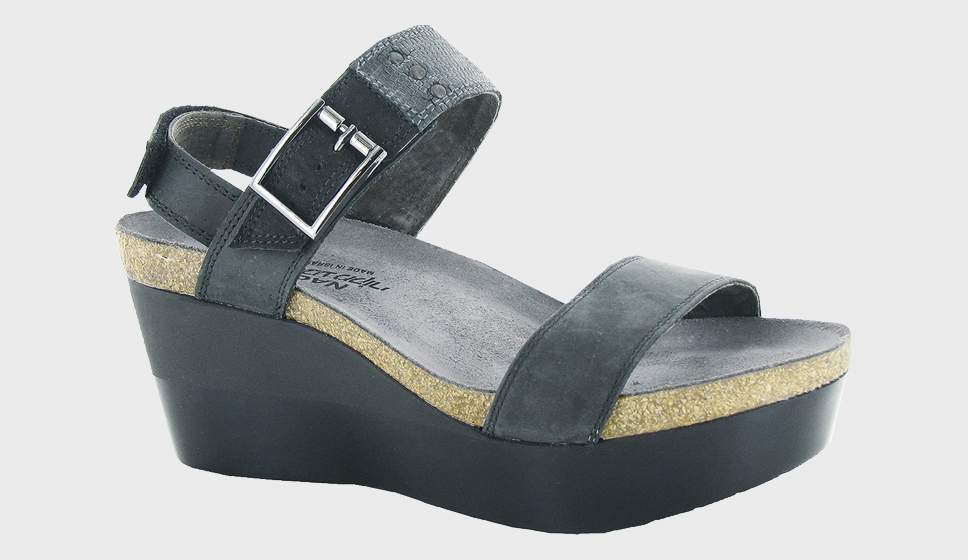 The Alpha is a trendy wedge sandal with a padded front strap for ultimate comfort. This style has a hook & loop backstrap and a faux buckle hook & loop strap at the instep. The instep strap has contrasting leather & rivet accents. Naot's anatomic cork & latex footbed is wrapped in a pampering suede and molds to the shape of the foot with wear. This style has a 3" polyurethane sole.