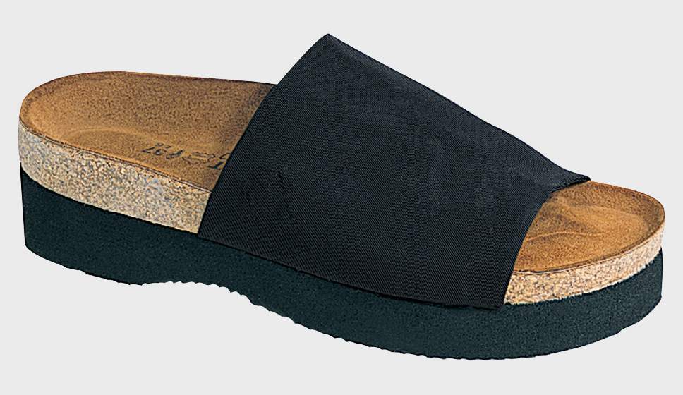 The Tampa is a stretch slide. Naot's anatomic cork & latex footbed is wrapped in a pampering suede and molds to the shape of the foot with wear. The Hi-Rise Collection features a 1.75" EVA sole.