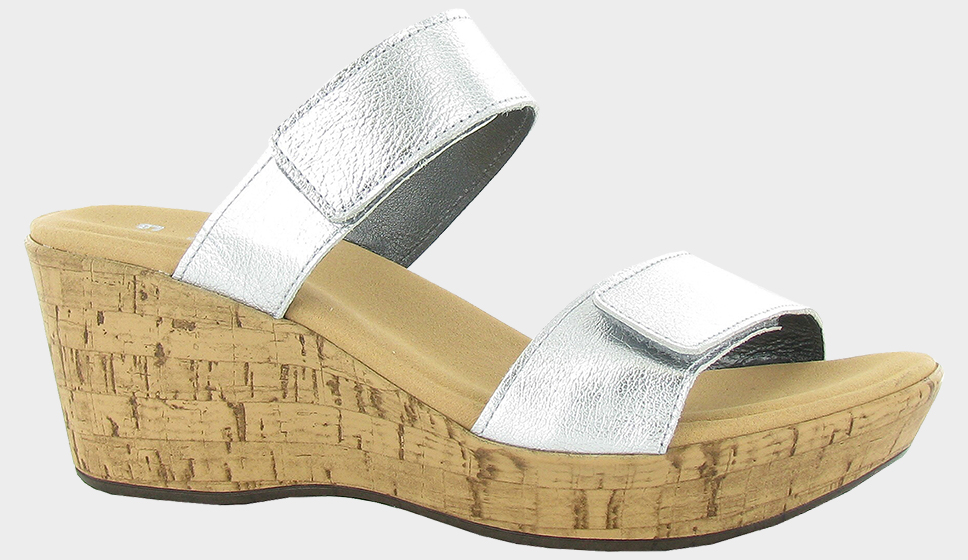 A fully adjustable wedge slide, the Caveran is lightweight and comfortable. It has two hook & loop straps that provide adjustability. Naot's anatomic cork & latex footbed is wrapped in pampering suede and molds to the shape of the foot with wear. The Resort Collection features a TPR sole, it offers the look of a 2.75 inch wedge without the feel.