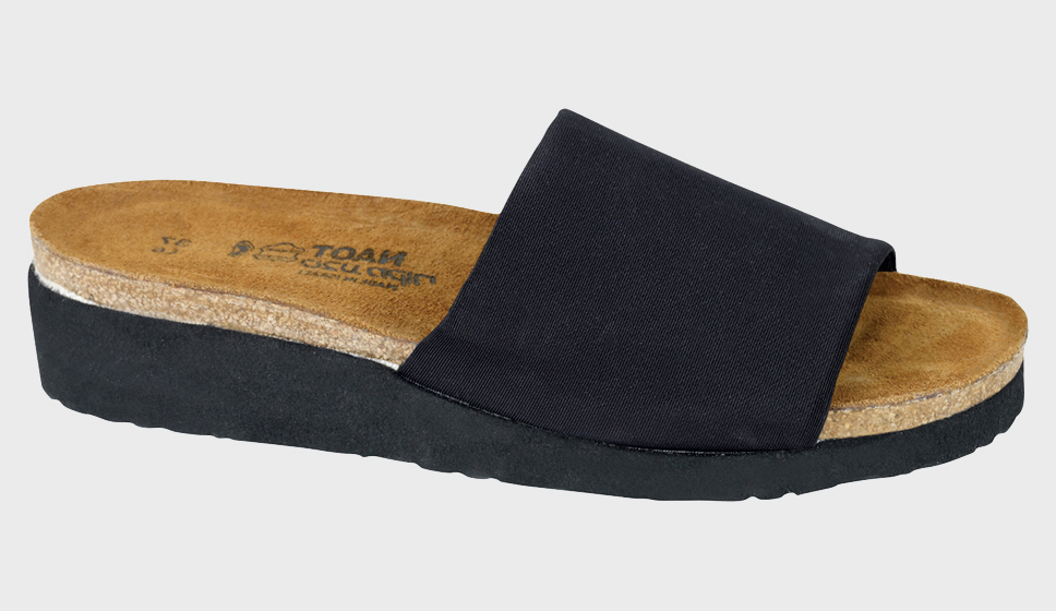 The Alana is a classic slide on sandal. This style has a stretch upper for accessibility and adjustability. Naot's anatomic cork & latex footbed is wrapped in a pampering suede and molds to the shape of the foot with wear.
