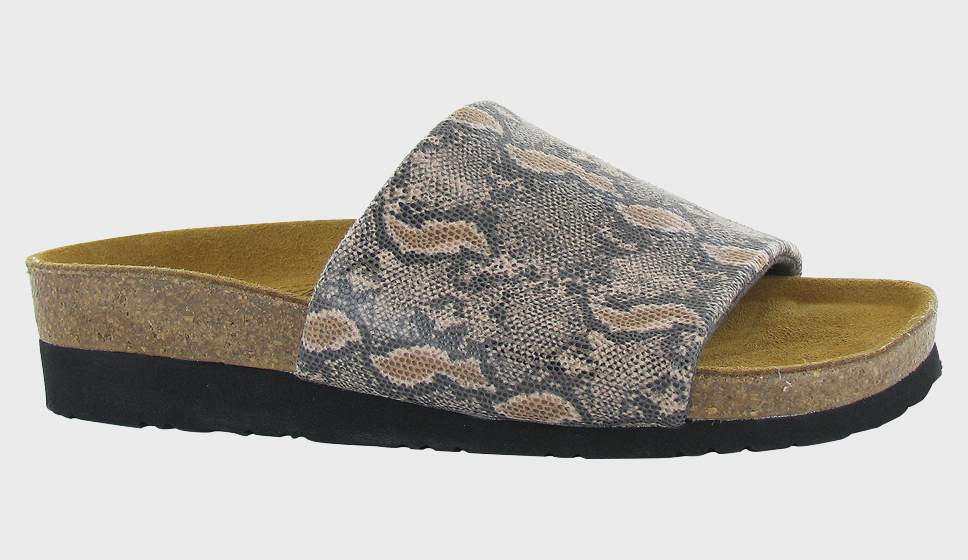 The Naot Ipanema is a great basic slide sandal with a functioning stretch upper. Naot's anatomic cork & latex footbed is wrapped in a pampering suede and molds to the shape of the foot with wear.