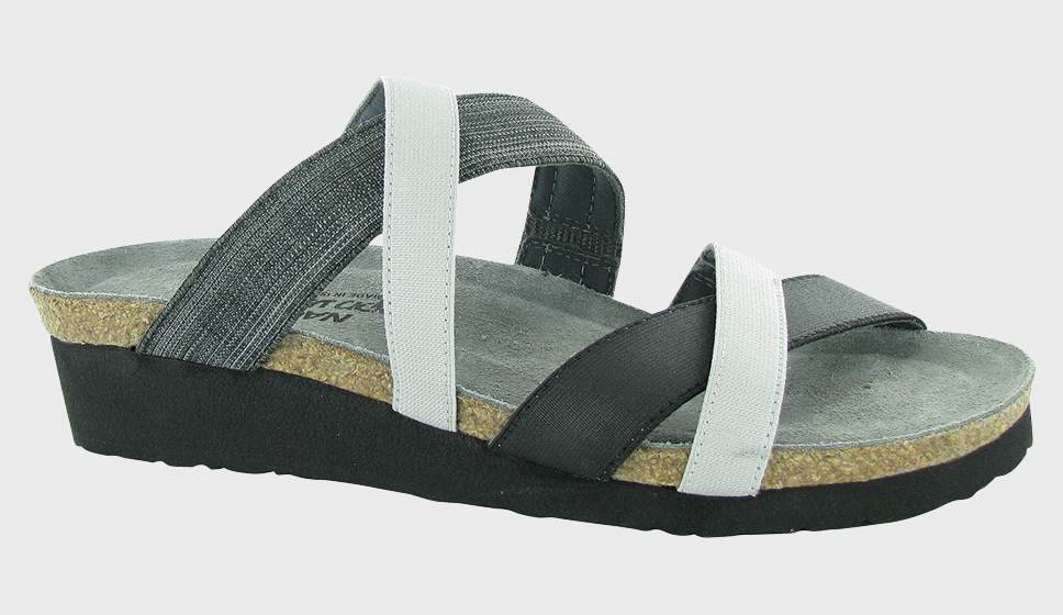 The Roxanna is a fashionable slide with contrasting colors. This style has padded technical lining creating comfort & absorbing moisture. The Roxanna features gore at the instep & front straps for adjustability. Naot's anatomic cork & latex footbed is wrapped in a pampering suede and molds to the shape of the foot with wear.