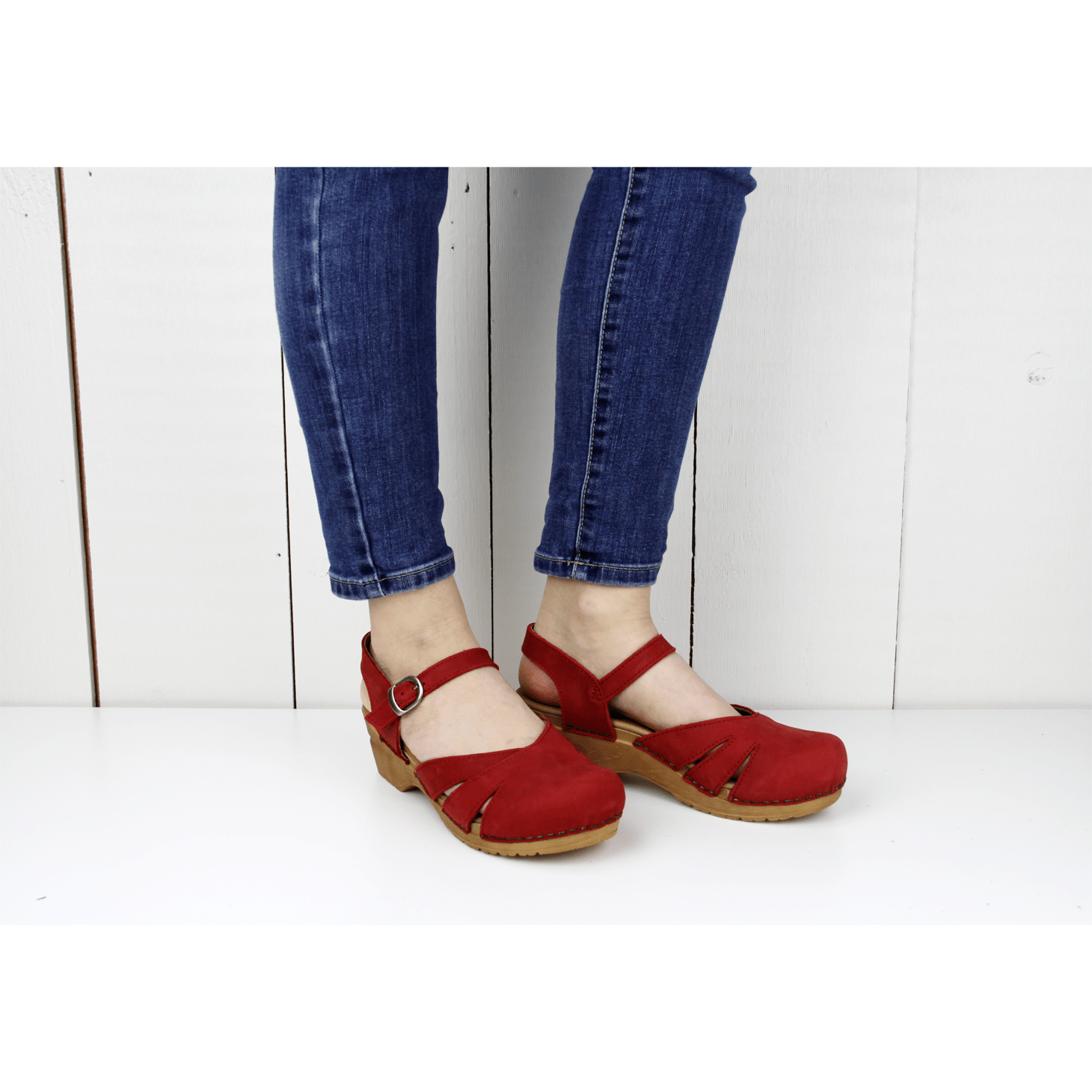 The Margrethe features a waxed dark red leather upper with small cutouts and an adjustable buckle on the strap. This sandal features a padded microfiber insole with an anatomically correct footbed. The polyurethane outsole features a rocker bottom. This style is approved by the APMA and part of our Professional Collection.