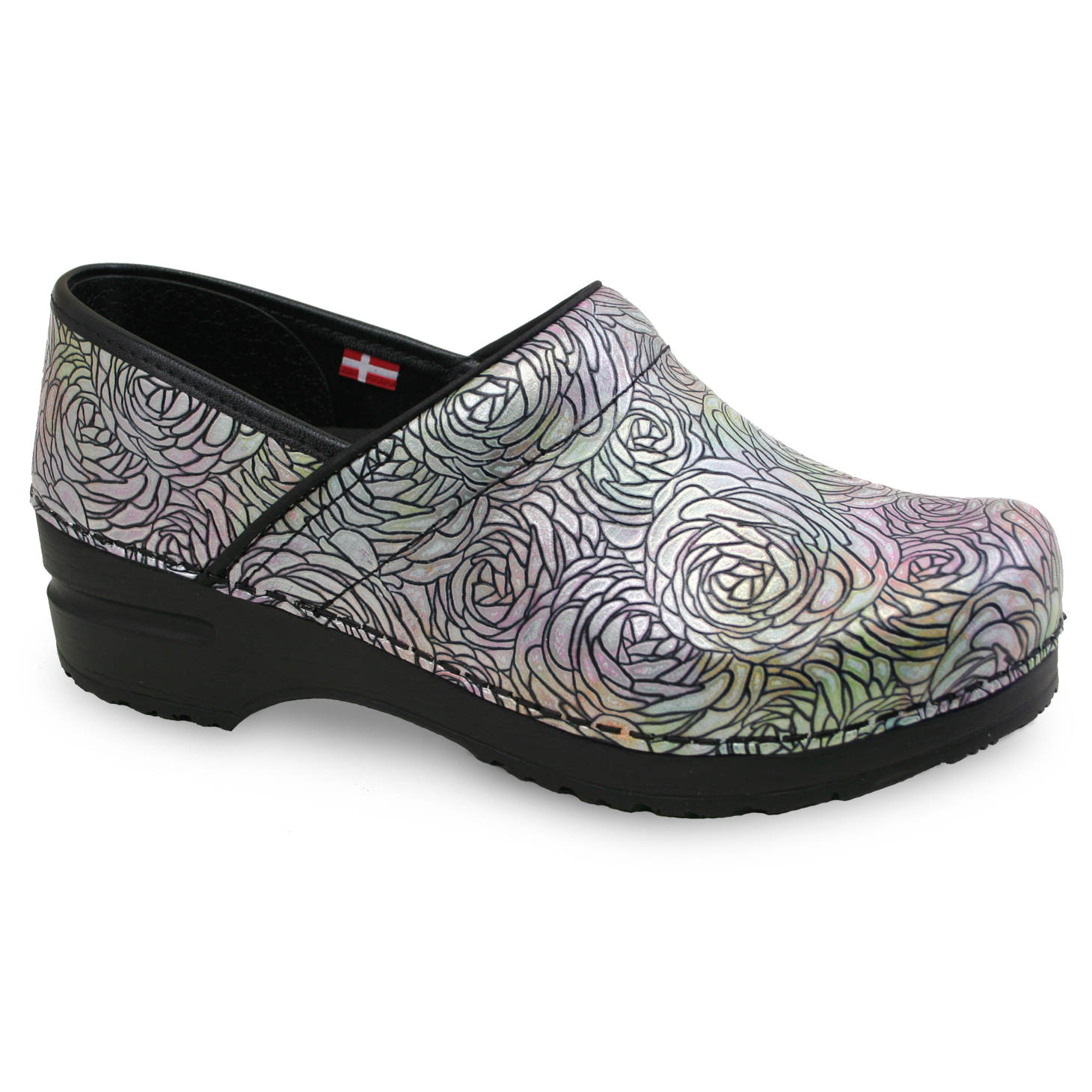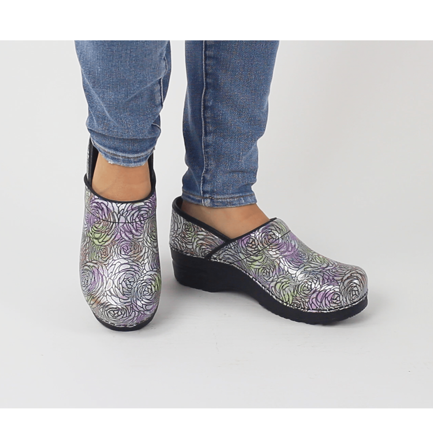The Mittersill clog features a silver iridescent embossed leather upper with a fairyale rose design. For extra comfort, our clogs feature a padded instep and microfiber insole with an anatomically correct footbed. The polyurethane outsole features a rocker bottom to make every step a breeze.