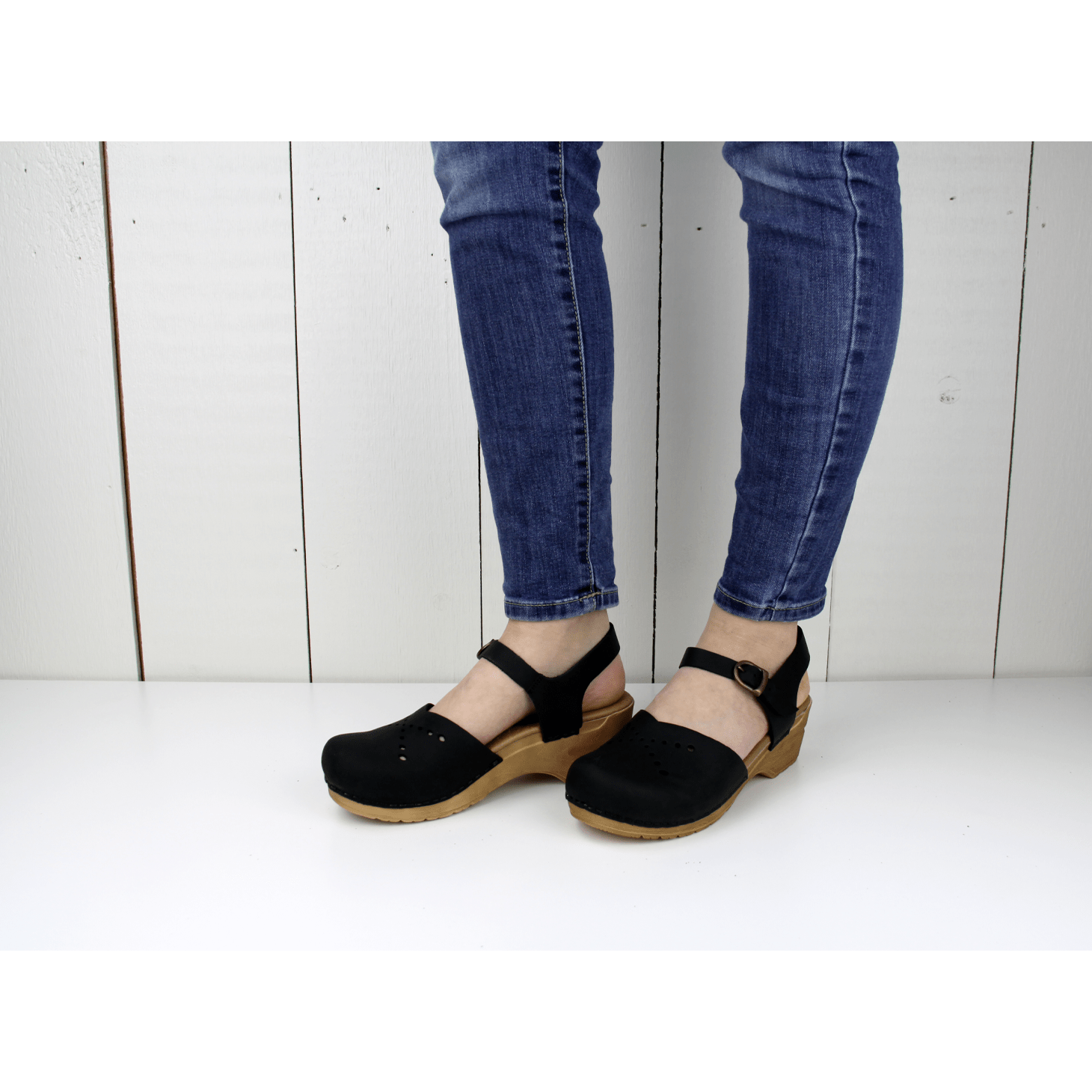 There should be a pinky sized gap between heel and back of clog, and plenty of room in toe box area. The instep will be the snuggest part of shoe and your heel should lift up slightly out of the shoe as you walk.