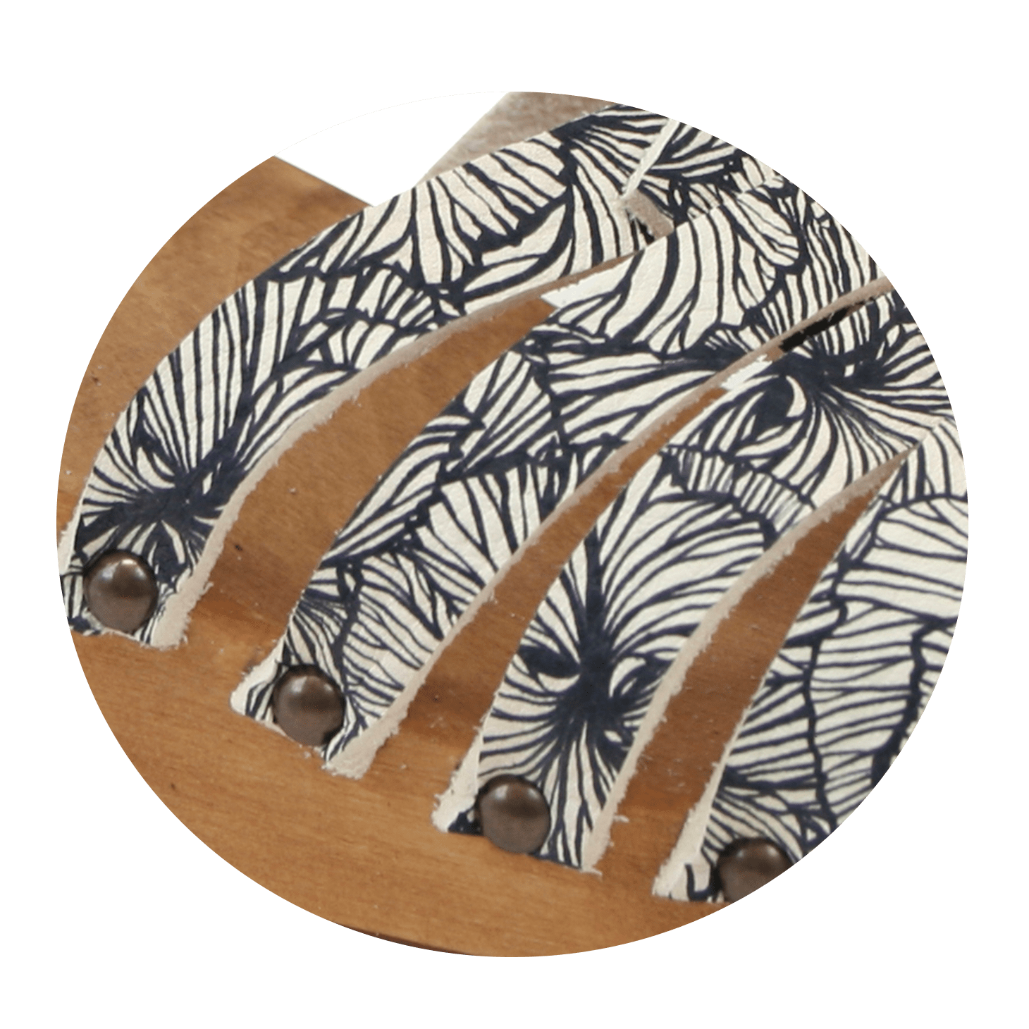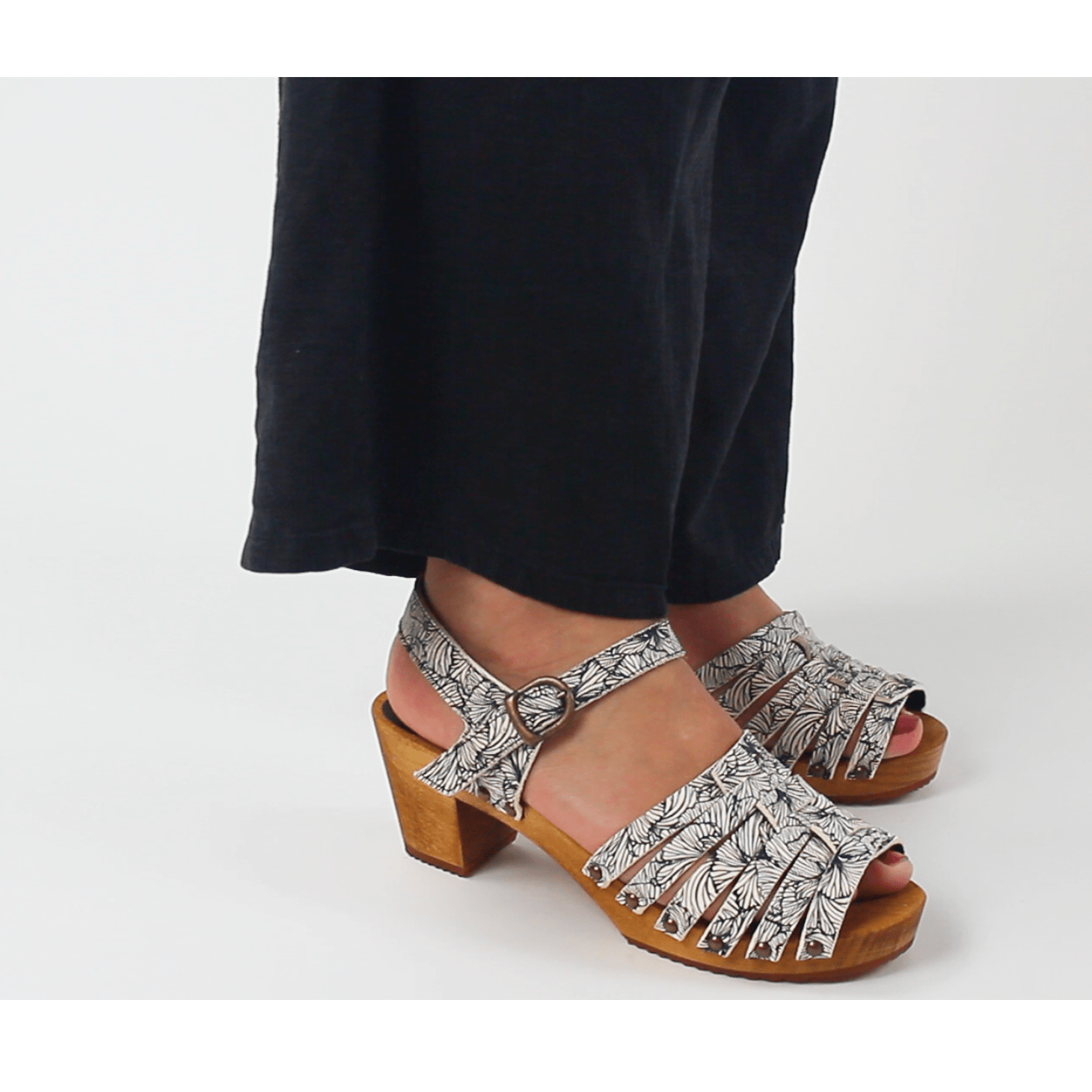 The Mida sandal features black and white floral print leather upper on wooden midsole with rubber outsole. The strap is adjustable for the perfect fit around your ankle. This sandal is made from wood harvested from FSC-approved sustainable forests.