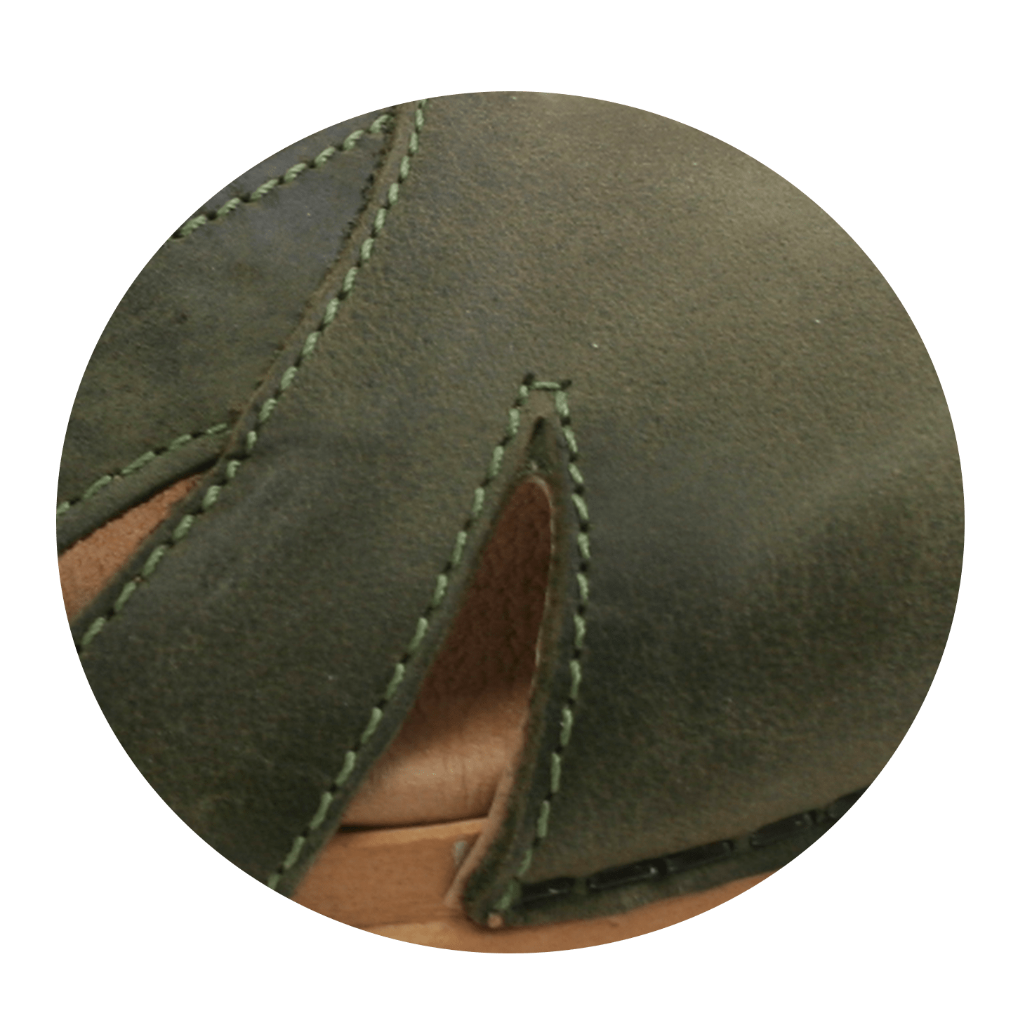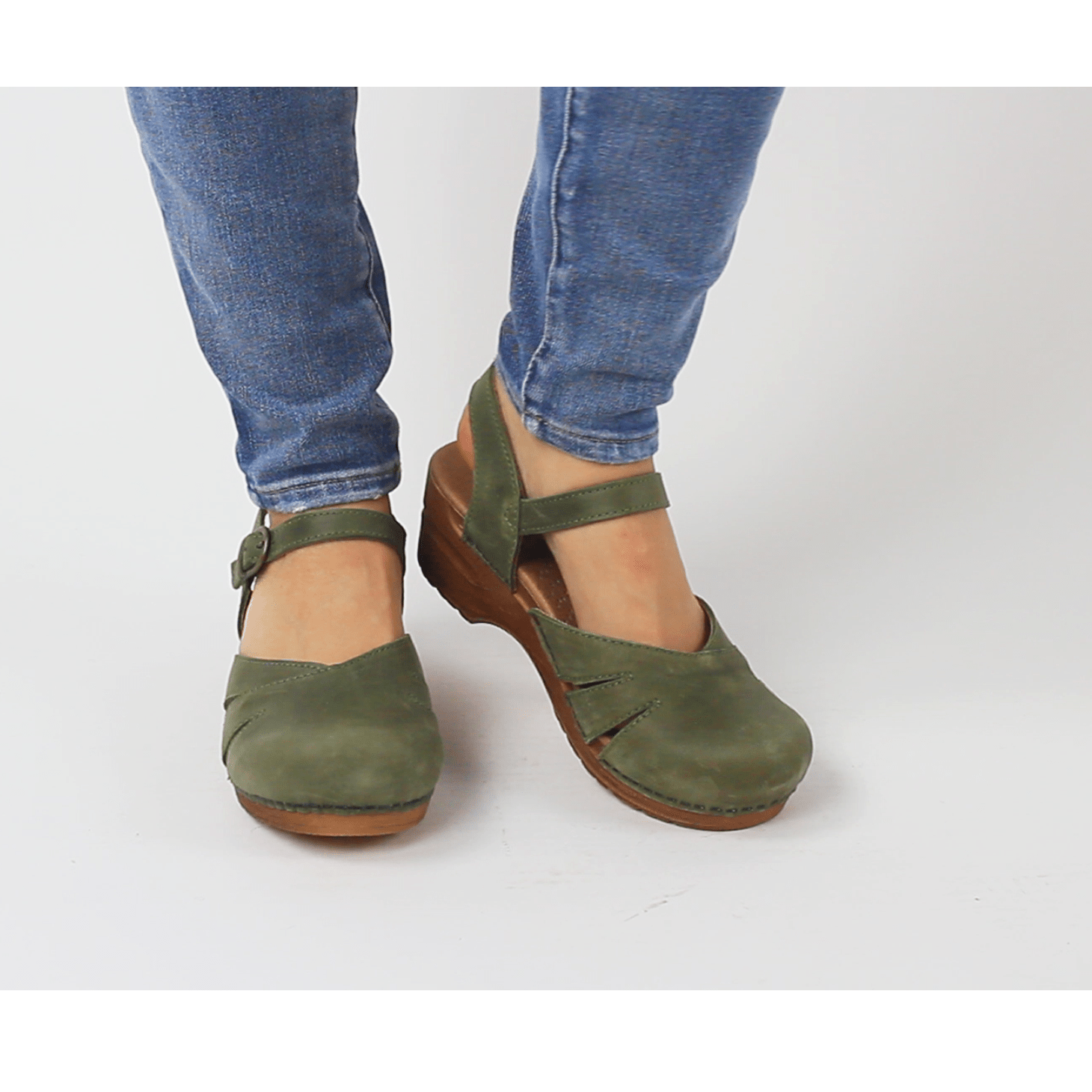 The Margrethe features a waxed khaki-colored leather upper with small cutouts and an adjustable buckle on the strap. This sandal features a padded microfiber insole with an anatomically correct footbed. The polyurethane outsole features a rocker bottom. This style is approved by the APMA and part of our Professional Collection.