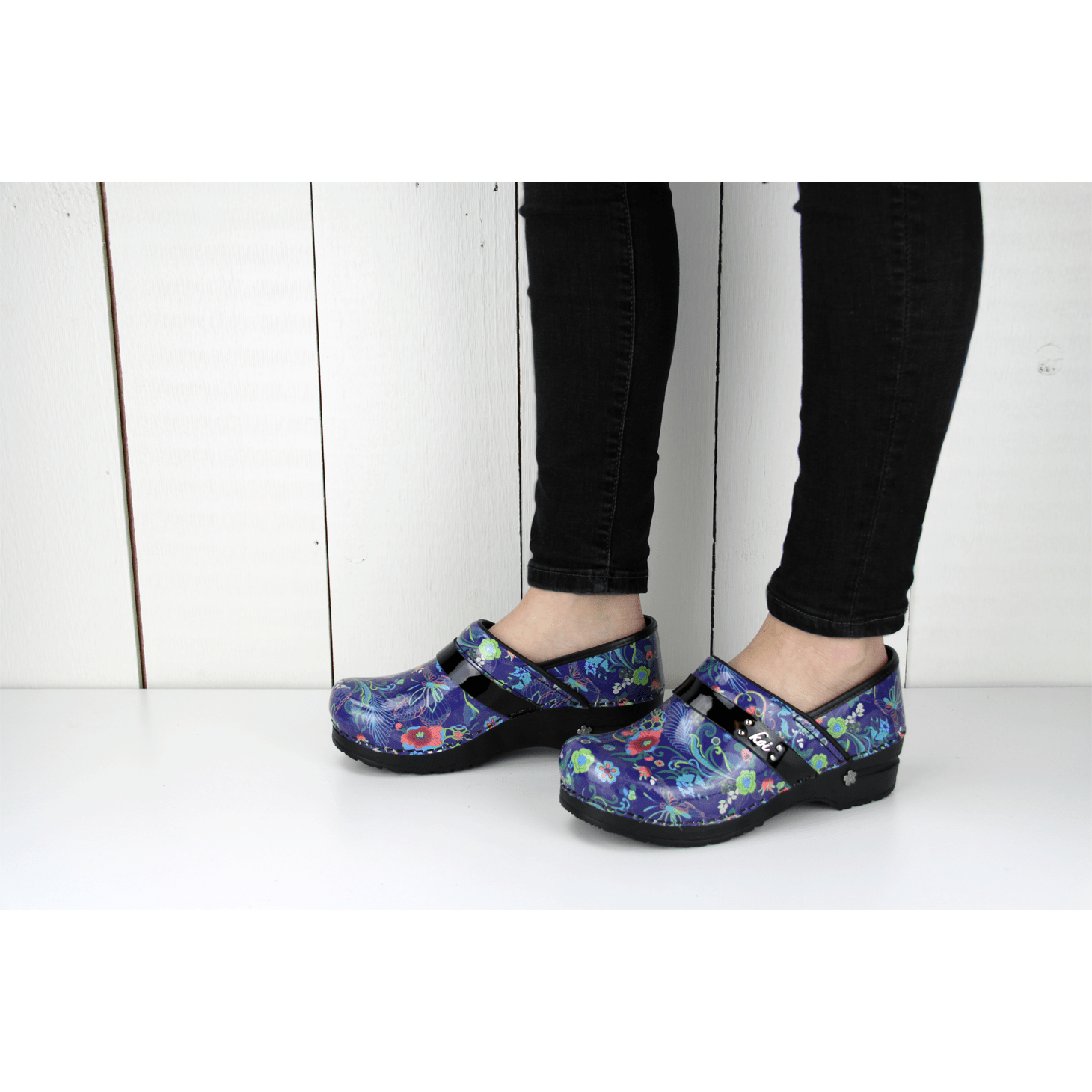 The Secret Garden clog features a printed patent leather upper with a lush tropical floral print, a padded instep and a microfiber insole with an anatomically correct footbed. The polyurethane outsole features a rocker bottom. This style is APMA approved and part of our Koi by Sanita Collection.