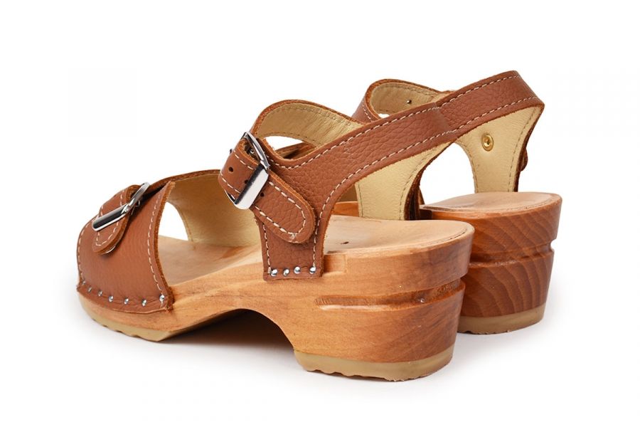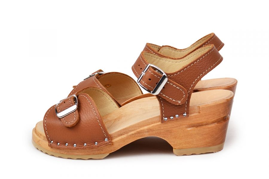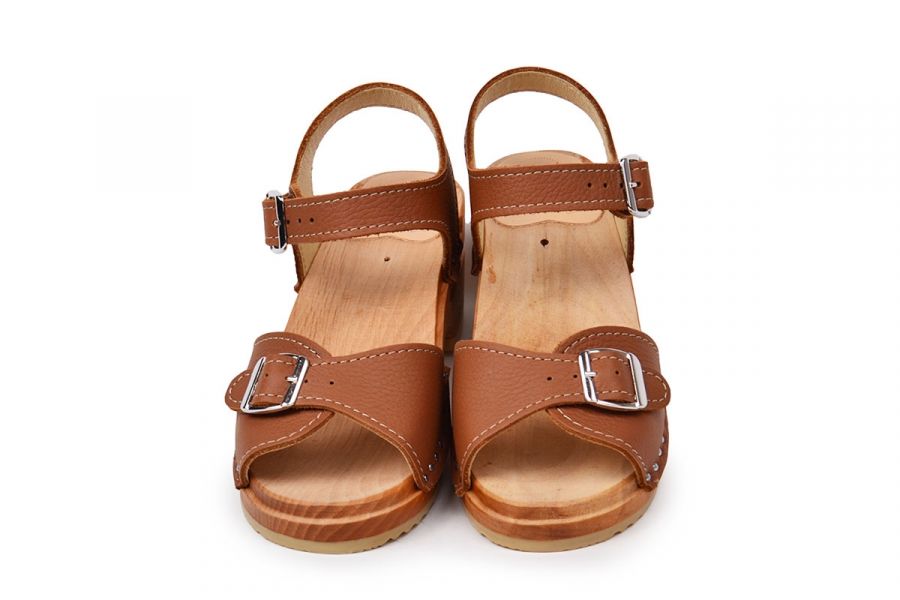 Kids clog sandal in light brown leather with an adjustable ankle strap and open toe, made on our varnished wooden bottoms.